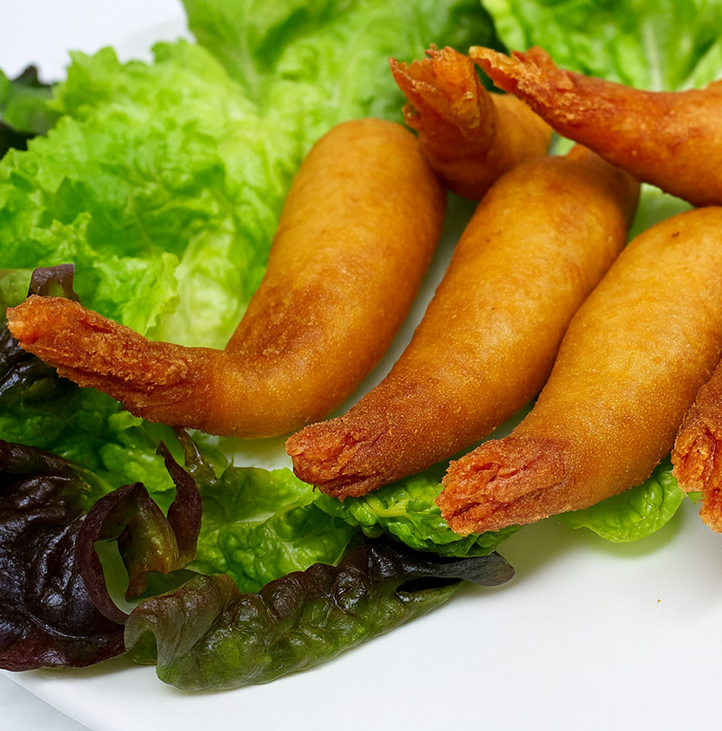 Colas de gambón peladas manualmente, enharinadas al estilo tradicional. Jugosos por dentro, crujientes por fuera. Perfectos para fritura rápida y presentaciones vistosas.